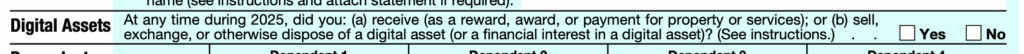 On the first page of Form 1040, taxpayers must answer a specific question regarding their digital asset activity: “At any time during the tax year, did you: (a) receive (as a reward, award, or payment for property or services); or (b) sell, exchange, or otherwise dispose of a digital asset (or a financial interest in a digital asset)?” (The wording of this question is updated periodically by the IRS.) This puts all taxpayers on record regarding their digital asset transactions for the year.